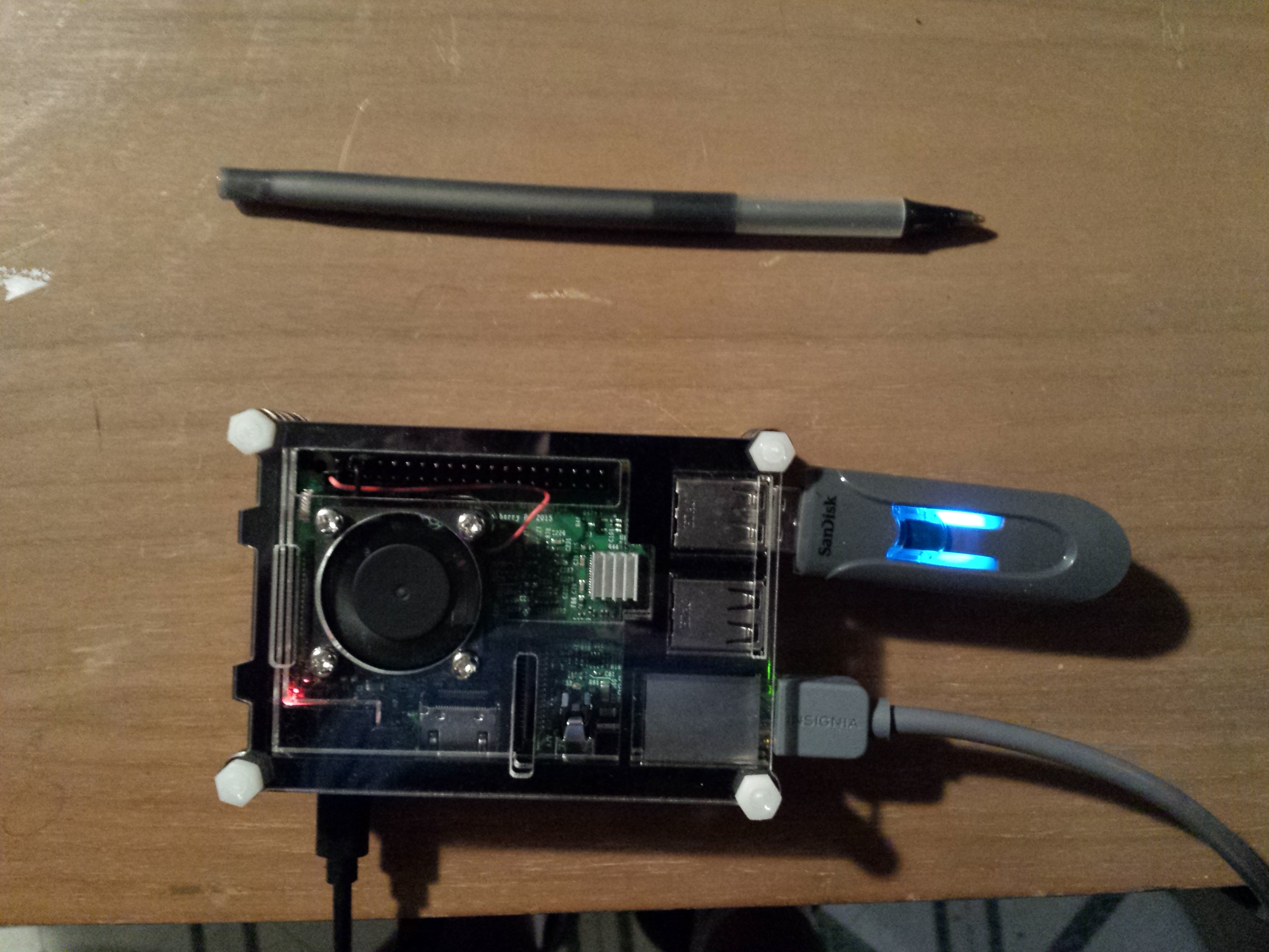 This is the computer serving this website. It is a Raspberry Pi 3b, a credit card size $35 single board computer in a $16 case complete with fan and power supply. A USB key provides secondary storage. A ballpoint pen is provided for size perspective. |